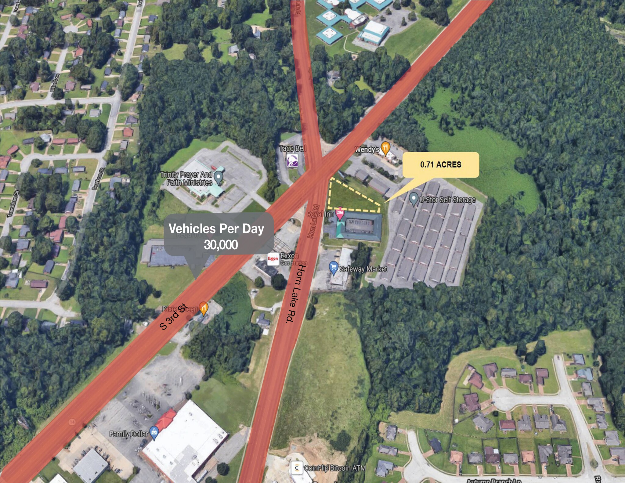 The Memphis Development Site is conveniently located at 4010 Horn Lake Road, Memphis, TN 38109. The property has 0.71 acres of available land. Nearby retailers include Safeway Market, Regal Inn, Dixie Queen, Taco Bell, Royal Inn, Walgreens, O'Reilly Auto Parts, AutoZone Auto Parts, Exxon, and more. The street on which the property is located brings in 28,354 vehicles per day. The 3 miles radius has a population count of 49,371. Below are a couple of additional comments: • Subject property sits in front of a busy cross section • Parcel is between Wendy's and Royal Inn • Access easement with Wendy's/Royal Inn • In front of U-Stor Self Storage • Commercial Zoning
