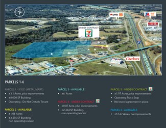 PARCELS 1-6 PARCEL 1- SOLD (METAL MART) • ±3.1 Acres, plus improvements SOLD - Metal Mart • ±8,000 SF Building • Operating - Do Not Disturb Tenant PARCEL 2- AVAILABLE • ±1.06 Acres, plus improvements • ±3,496 SF Building, non-operating/vacant PARCEL 3- AVAILABLE • ±9.13 Acres, plus improvements • Lease in place through 1/30/2025 • Operating - Do Not Disturb Tenant PARCEL 4- UNDER CONTRACT • ±0.87 Acre, plus improvements • ±2,364 SF Building, non-operating/vacant PARCEL 5- UNDER CONTRACT • ±1.97 Acres, plus improvements • Operating Truck Stop • No brand agreement in place PARCEL 6- AVAILABLE • ±17.67 Acres, no improvements