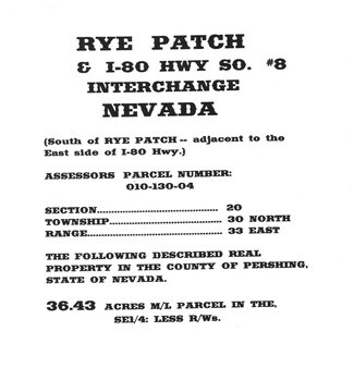 Across I-80 New Proposed RV TRUCKSTOP – RESTURANT, OFFICES. BORDERS THE I-80 FREEWAY-INTERSTATE FRONTAGE MILES OF EXPOSURE APN: 010-431-06 INCLUDING A 1.55 ACRES PARCEL = LEVEL PARCEL SIZE BEING TOTAL .. 37.98 ACRES m/l. ACCESS, CHIMMEY CREEK ROAD, HRRE– LOT 29.. BLOCK: A - LOVELOCK, LEVEL LOT 205’ X 330’ THE PROPERTY HAS THREE -3- LEGAL ROAD ACCESS ON GOOD ROAD, RESIDENTIAL ELECTRIC. FOR FUTURE INDUSTIAL / COMMERCIAL DEVELOPMENT WOULD NEED ELECTRICIAL UPGRADE. LOW REAL ESTATE TAXES. NEAR FUEL-GROCERY STORE, STATE PARK, FISHING-BOATING 17 Mile LAKE. DRONE AREA NEARBY. VIDEO PHOTOS. https://www.humboldtriverranchassociation.com/ PROPERTY IS LAND ONLY, FEE OWNED, HAS NOT BEEN TITLE CHECKED FOR MINERAL RIGHTS. ON ALL OF OUR US & CANADA PROPERTIES, THERE HAS BEEN NO MINERAL EXPLORATION. 720-542-8269 // 503-321-5030