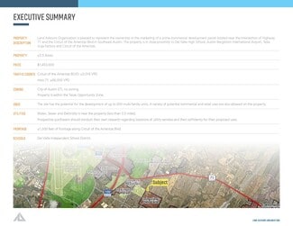 Land Advisors Organization is pleased to represent the ownership in the marketing of a prime commercial development parcel located near the Intersection of Highway 71 and the Circuit of the Americas Blvd in Southeast Austin. The property is in close proximity to Del Valle High School, Austin Bergstrom International Airport, Tesla Giga Factory and Circuit of the Americas. The site has the potential for the development of up to 200 multi-family units. A variety of potential commercial and retail uses are also allowed on the property.