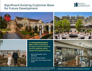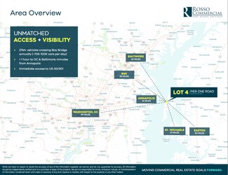 Immediately adjacent to the property, The Inn at the Chesapeake Bay Beach Club (CBBC) welcomes guests to 77 boutique rooms and cottages, a full-service spa and multiple dining venues, creating a built-in year-round customer base steps from the site. 4 Acre Lot A Proven Destination Node. As the region's premiere waterfront wedding & events venue, CBBC and the Inn welcomes approximately 17,000 overnight guests annually and serves over 50,000 guests annually at their restaurants and events. Convenient Amenities: Nearby Libby's Coastal Kitchen, Knoxie’s Table, CBBC, Bay Bridge Airport, Bay Manor Apartments, Target, and more Unmatched Access + Visibility: Easy access to Chesapeake Bay Bridge / Rte. 50 as well as Easy Commute to Major City Centers: – Annapolis: 15 Miles – Baltimore: 44 Miles – Washington, DC: 40 Miles – Easton: 30 Miles – St. Michaels: 37 Miles Contact broker for additional information