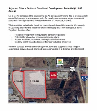 Adjacent Parcel Available: Directly east of Lot 6 is a ±9.73-acre site fronting 450 S—also zoned CC and available for purchase. Together, these parcels offer 13.86 contiguous acres of commercial development potential in a high-demand submarket of Columbus, Indiana.