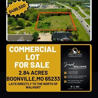 Secure a remarkable opportunity to develop an expensive tract of vacant land, neighboring Walmart and boasting 275 feet of main street frontage in the rapidly expanding region of Boonville Missouri. Jared Williams of First Class Properties await your call at 660-216-3722 or his office at 660-734-0506.