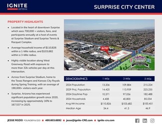 • Located in the heart of downtown Surprise which sees 700,000 + visitors, fans, and participants annually at a host of events at Surprise Stadium.