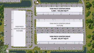 At 1030 Pace Center Drive, the building features 26-foot by 105-foot bays starting at 5,460 square feet, expandable up to 43,852 square feet.