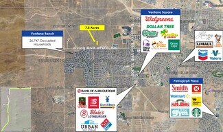 ? Price: $378,8000 ? 7.5 Acre Lot (12.5 ac available) ? Lot SF: 326,700 ? Price/SF: $1.16 ? Located 500 feet from Utilities on Prickly Brush St NW. ? Adjacent 5 ac MLS #1004317 ? Situs Address: Rio Rancho NM 87114 ? Area: 120 - Paradise West ? County: Bernalillo ? UPC: 100906605509930106 ? VPD: 2800 on Irving Blvd.