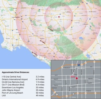 The park is close to Ontario International Airport, 6.9 miles away, a mid-sized, full-service airport providing freight solutions to major US cities and international destinations. Oakmont Mission Ramona Business Park has great access to Interstate 10, Highway 60, Highway 71, and Interstate 15 freeways throughout Southern California and beyond. Other modes of distribution are found within an hour's drive from the park, including the John Wayne Airport, the Ports of Los Angeles and Long Beach, and Los Angeles International Airport. Within a day's truck drive, users can access a population of over 9 million residents in Los Angeles, San Diego, Las Vegas, Phoenix, San Jose, and San Francisco.