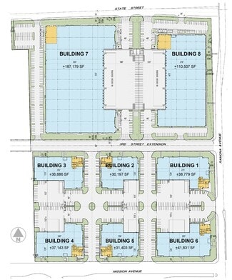 Facility users have access to state-of-the-art features in every building, including dock-high and grade-level loading doors, ESFR fire sprinkler systems, a 4-ply build-up roof with a 15-year NDL warranty, white scrim insulation, and ample power of 277/480 volts, 3-phase, 4-wire. Buildings 1 through 6 feature 30 feet of clear height and 2.5% of skylights. Buildings 7 and 8 have 32 feet of clear height, 3% of skylights, and 40,000-pound medical load levelers at every other door and LED warehouse lighting. Fenced and secured concrete truck yards are provided for every building. Open to many manufacturing uses, Buildings 1 through 6 are zoned MIP for Manufacturing Industrial Park, and Buildings 7 and 8 are zoned M1 for Limited Manufacturing.