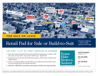 Lebanon Retail Pad for Sale or Build-to-Suit LOT SIZE: 11,571 SF | BEST LOCATION IN LEBANON! • New retail center located at the busiest signalized intersections in Lebanon, OR. (SE corner of Hwy 20 & S. Airport Rd). Traffic Count: 30,700 VPD • Opportunity to join brand new Starbucks drive-thru, AT&T, Jack-in-the-Box and Gentle Dental. • Other surrounding retailers include Safeway, Taco Bell, Auto Zone, Rife’s Home Furniture, Burger King, Les Schwab and more. • Sale Price: $229,000