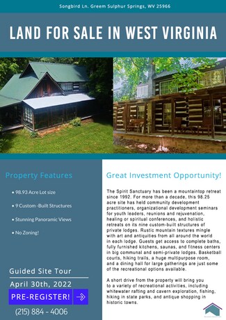 Highlights: Excellent investment Opportunity. Priced reduced! Since 1992, this beautiful mountain top oasis has been known as the “Spirit Sanctuary”. Comprised of 79.99 acres and 9 custom built structures of individual lodges and special purpose buildings, this campus has hosted group development activities, company team development training, youth development training, reunions, conferences, and holistic retreats. Each lodge blends rustic mountain textures with art and artifacts. Guests have shared large common and semi-private lodges as well as full baths, fully equipped kitchens, sauna, and fitness facilities. Recreational amenities include a basketball court, hiking trails, a large multipurpose room, and a dining hall for large group meals. In addition, this property is near to activities such as Greenbrier Country Club golfing, antiquing in historic Lewisburg, WV, New River Gorge white water rafting, cave exploring, spelunking, hiking on-site or at local state parks and Hot Springs.