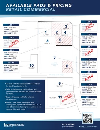 Right off the I-15 Benjamin Exit into Salem! This site has frontage on Loafer Mountain Parkway and 17th North which is currently under construction. Traffic Report estimates 29,500 trips per day will be produced from the New Salem Masterplan. A great location for commercial/retail right at the entrance of Salem, Woodland Hills, and Elk Ridge. Just south of New Salem will be the brand new Arrowhead Park, which will host 5 Baseball/Softball diamonds and soccer fields for large sporting events. New Salem, the newest master planned community in Salem, UT, is strategically positioned on the corner of 8000 South (SR-164) and the newly completed Loafer Mountain Parkway. New Salem is a large mixed use masterplan with 1,900+ residential units planned. - All pads, with exception to those sold, can be sized/subdivided to fit. - Seller to deliver super pads to Buyer with perimeter roads installed and utilities stubbed to the lot. - Buyer will be responsible for all onsite development. - Zoning - New Salem master plan with development agreement allows for the C1, C2, and C3 commercial zoning to be utilized in our commercial/retail center.