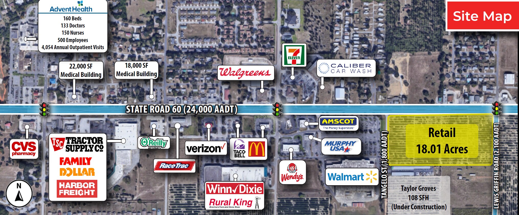 Surrounding Retailers include Walmart, Wendy’s, Caliber Car Wash, 7-Eleven, McDonald’s, Taco Bell, Walgreens, Rural King,Winn Dixie, Verizon, Racetrac, O’Reilly Auto Parts, Tractor Supply Company, Harbor Freight Tools, Bank of America, and CVS.