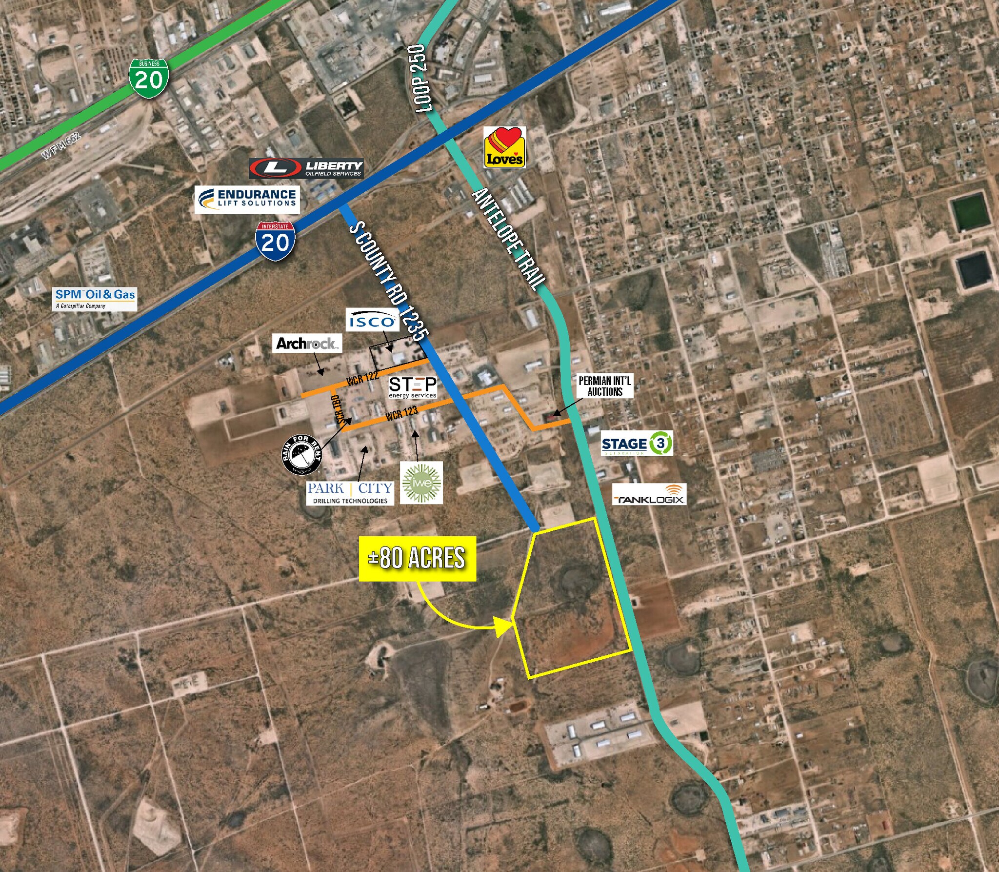 ±145 Acres of Raw Land Prime for Development! ±65 Acres of this parcel have been sold leaving ±80 Acres available. This is a premium piece of land with over 4,000' of frontage on Antelope Trail, the extension of Loop 250 on the west side of Midland. This tract is in the direct path of development and will be the next piece to be improved. A combination of hotels, truck stops/c-stores, multi-tenant flex, and single tenant industrial warehouses have been or are being developed all along Antelope Trail. Unlike many land tracts of this size in the Permian Basin, you won't find a bunch of drill-sites, pipelines or electrical lines crossing this property. The owner is open to subdividing the acreage with a minimum tract size of 40-50 acres, at a premium price. The site is outside city limits, in the ETJ of Midland and will require a water well and septic system. ATT Fiber is north of the tract along Antelope Trail.