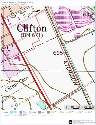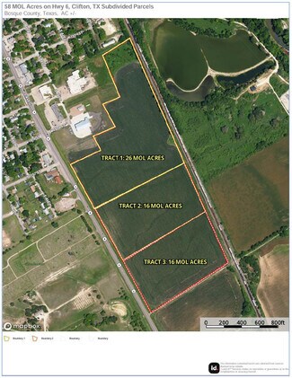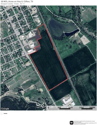 This rectangular-shaped property is ideal for investment or development as it has over 1,900 feet of road frontage along Hwy 6 and over 1,000 feet in depth from the road to the back of the property. Electricity runs along the front of the property and parallel to Hwy 6; railroad tracks run parallel to the back of the property along with transmission lines that run partially along the back of the property and along the southern boundary. Access to city water and sewer. Property is currently unfenced and improved farmland that is ag-exempt. There is a commercial billboard on the southern end of the property along Hwy 6 that pays the landowner an annual rental income. Seller is also offering the property in 3 subdivided parcels from 16-26 acres.