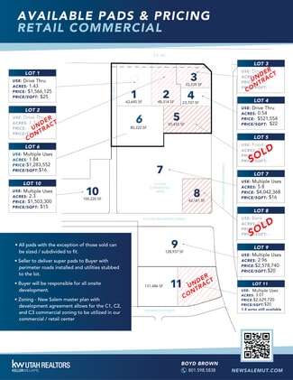 - Seller to deliver super pads to Buyer with perimeter roads installed and utilities stubbed to the lot.