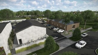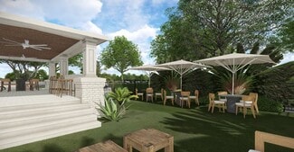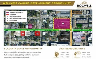 • Three-building campus with 20-foot ceilings and indoor-outdoor integration.