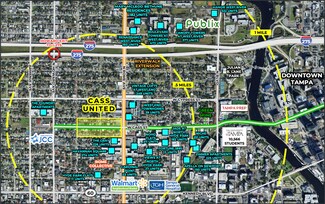 Cass United is a wellness-focused mixed-use development located along West Cass Street between Albany Avenue and Rome Avenue in North Hyde Park, Tampa, Florida. The site is positioned near the University of Tampa, Tampa Preparatory School, and major roadways including I-275 and Kennedy Boulevard. The project includes multiple buildings with indoor and outdoor spaces and is adjacent to planned infrastructure improvements such as the Tampa Riverwalk extension and Green Spine Cycle Track.