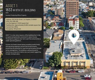 • ASSET 1: Fully occupied two-story office building located at 1833 W 8th Street (APN: 5142-006-009), totaling approximately 20,600 rentable square feet on an approximately 12,023 SF C2-1 zoned lot, providing stable in-place income with significant upside as current rents are below market, offering a strong opportunity to stabilize and increase cash flow.